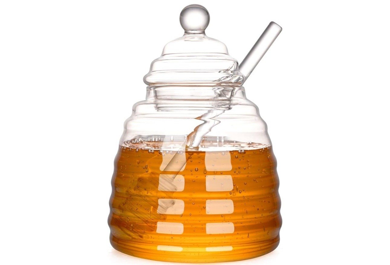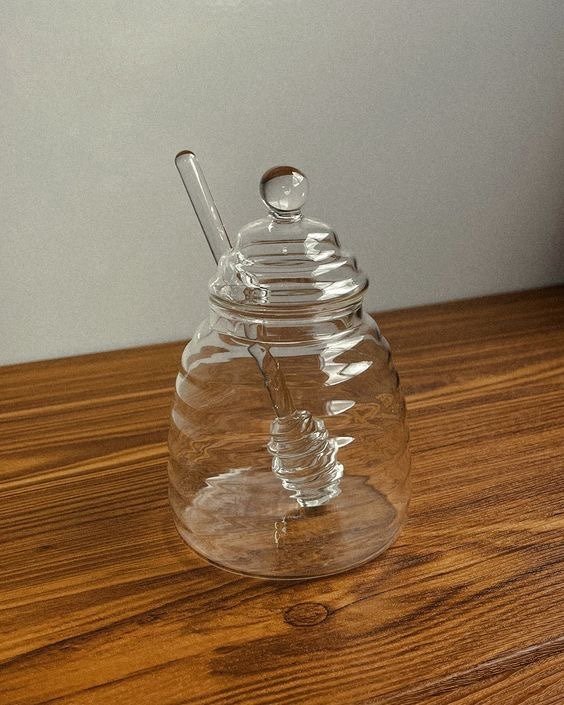 Keep honey fresh and easy to serve with this ribbed glass honey jar and dipper. Designed with a clear ribbed finish, it adds a modern touch to your kitchen or tea table. Perfect for honey, syrup, or jam.