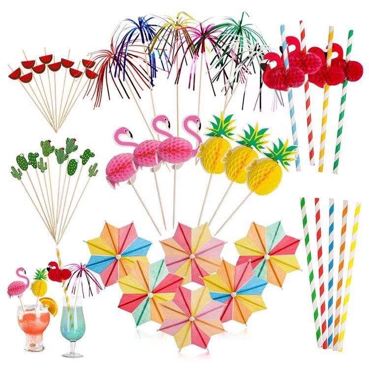 Contains paper straws, flamingo paper straws, octagonal umbrellas, and fireworks sticks.