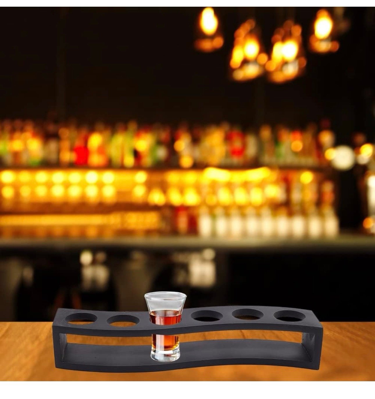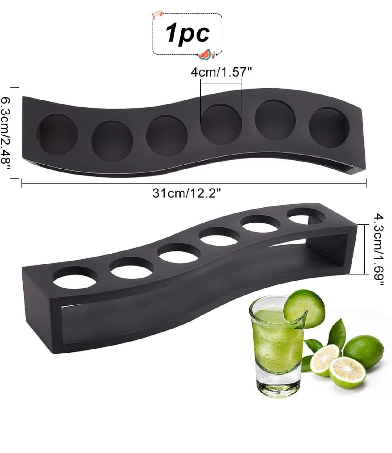 - Wave Shape 6 Shot Glass Tray — You will receive 1 pc shot glass holder, color: black. Size: about 2.48 inch(6.3cm) wide, 12.2 inch(31cm) long, 1.69 inch(4.3cm) high, hole: 1.57 inch(4cm). Please note that the bottom diameter of the glass cup placed in the holder must be less than 1.57″.