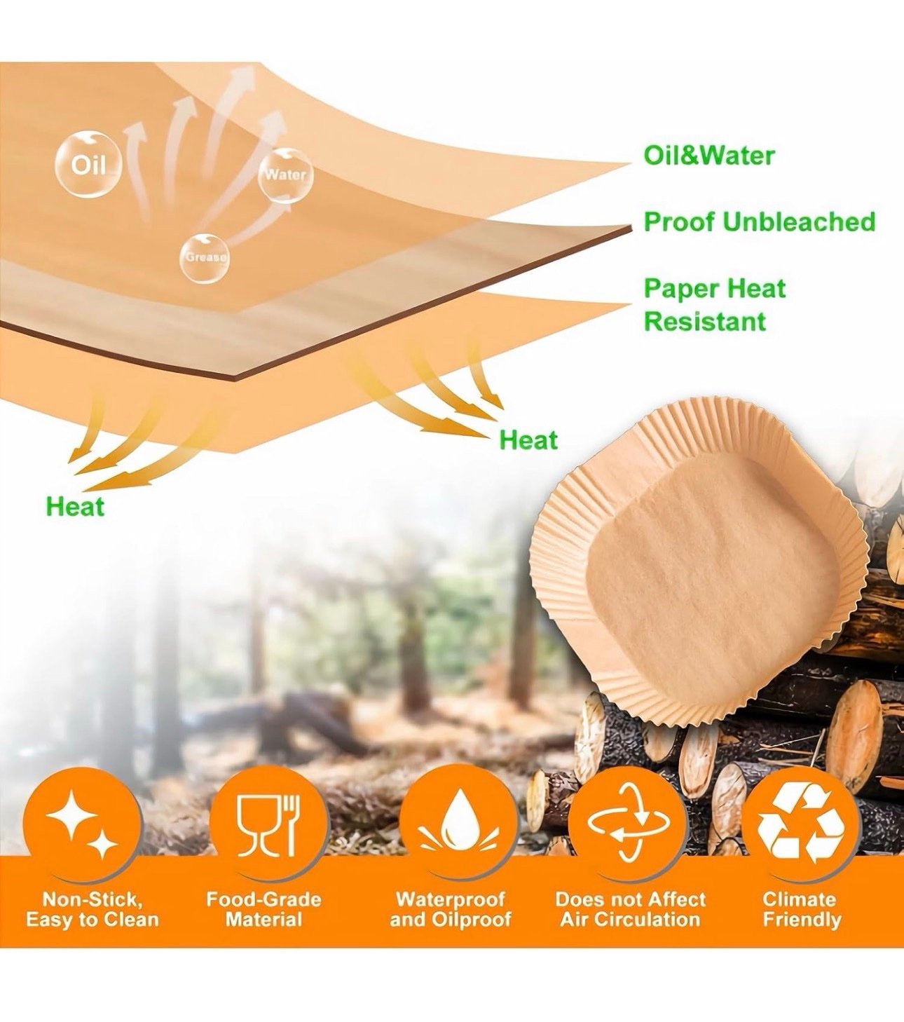 - Food Grade Material: Airfryer paper liners are made of unbleached food-grade parchment paper that is water-proof, greaseproof, fully compostable, and non-stick. This allows for usage with all foods. The materials are free of Bleach, ensuring that there are no harmful chemicals.