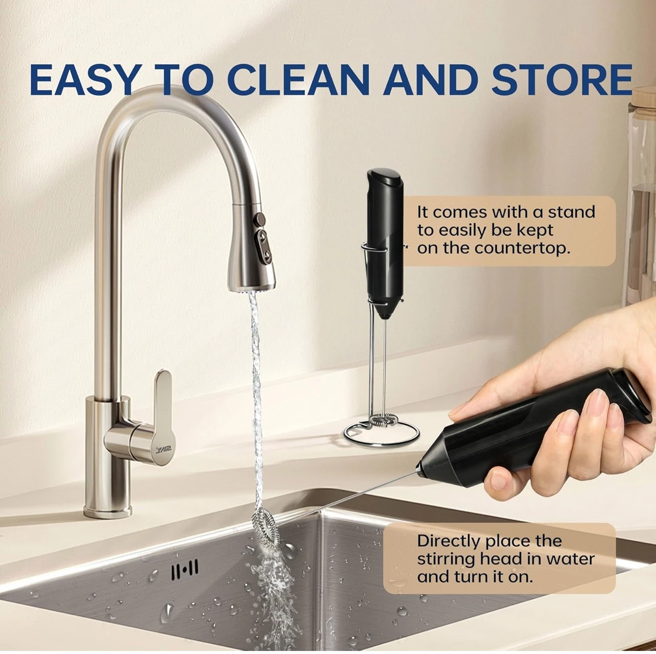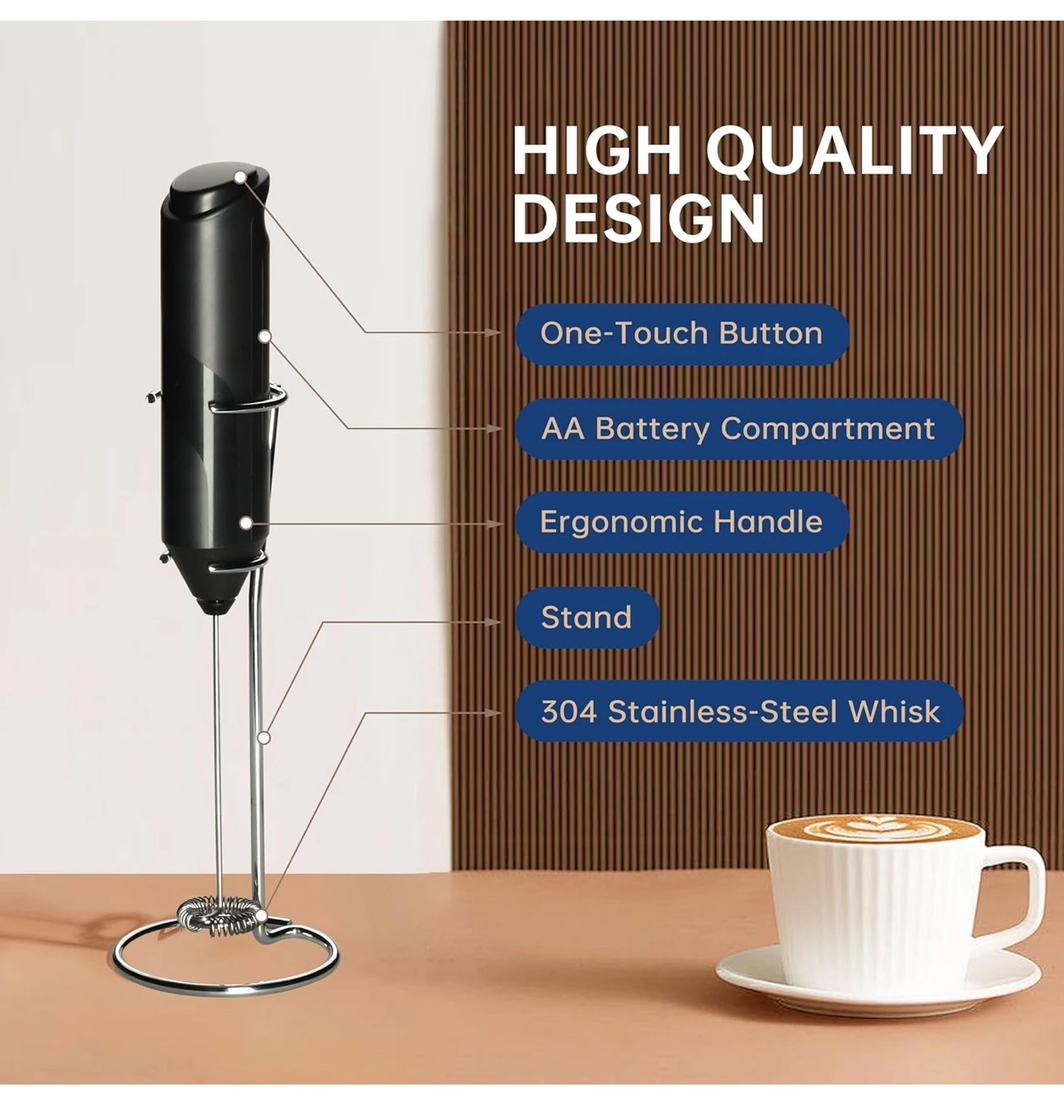 Battery Milk Frother Handheld with Stainless Steel Stand Battery Operated Whisk Drink Mixer for Coffee, Frappe, Latte, Matcha, Hot Chocolate, Mini Hand Blender, Black.