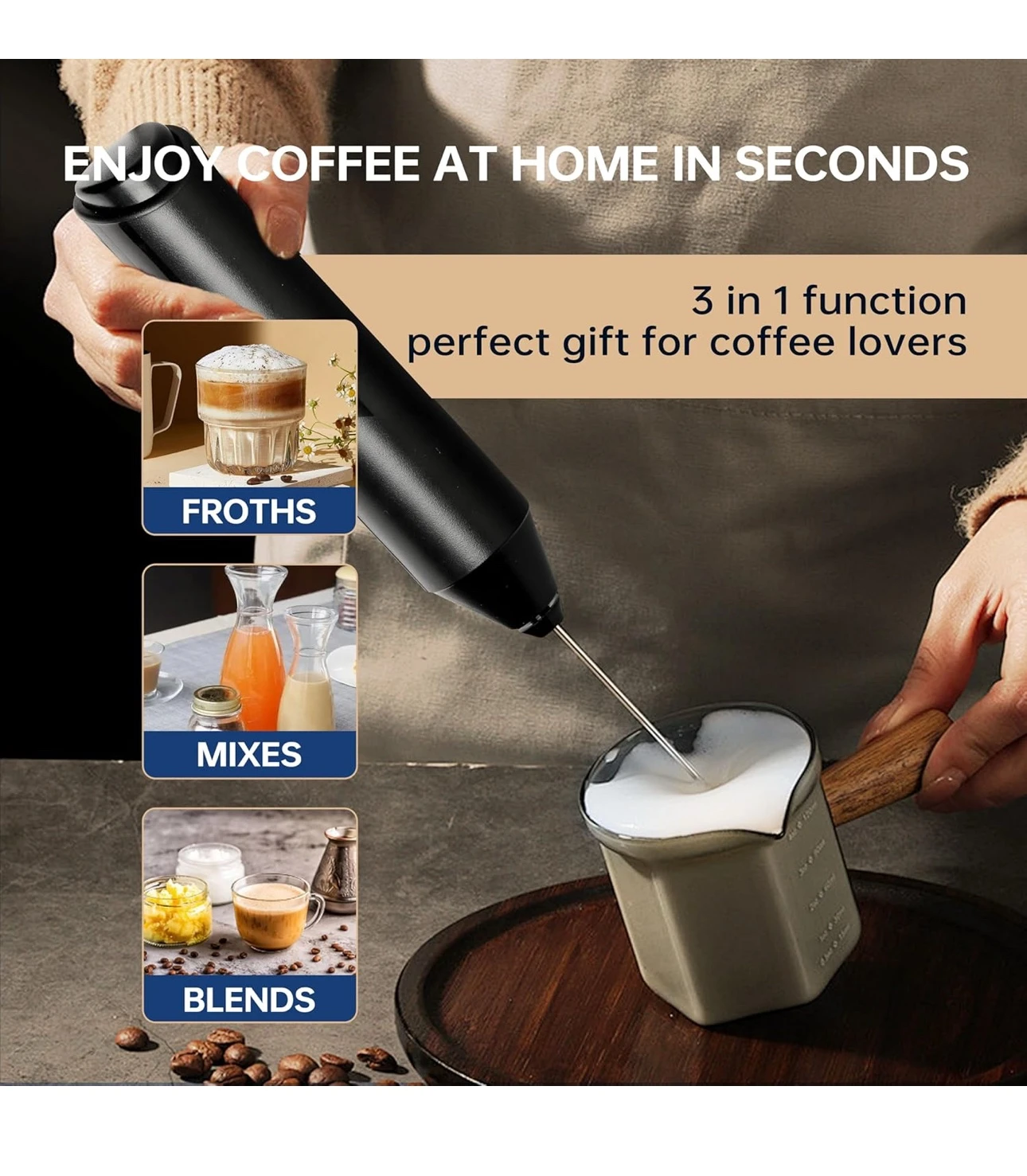 Rechargeable Milk Frother Handheld with 3 Detachable Stainless Steel Whisks, 3 Speed Adjustable Electric Whisk Foam Maker