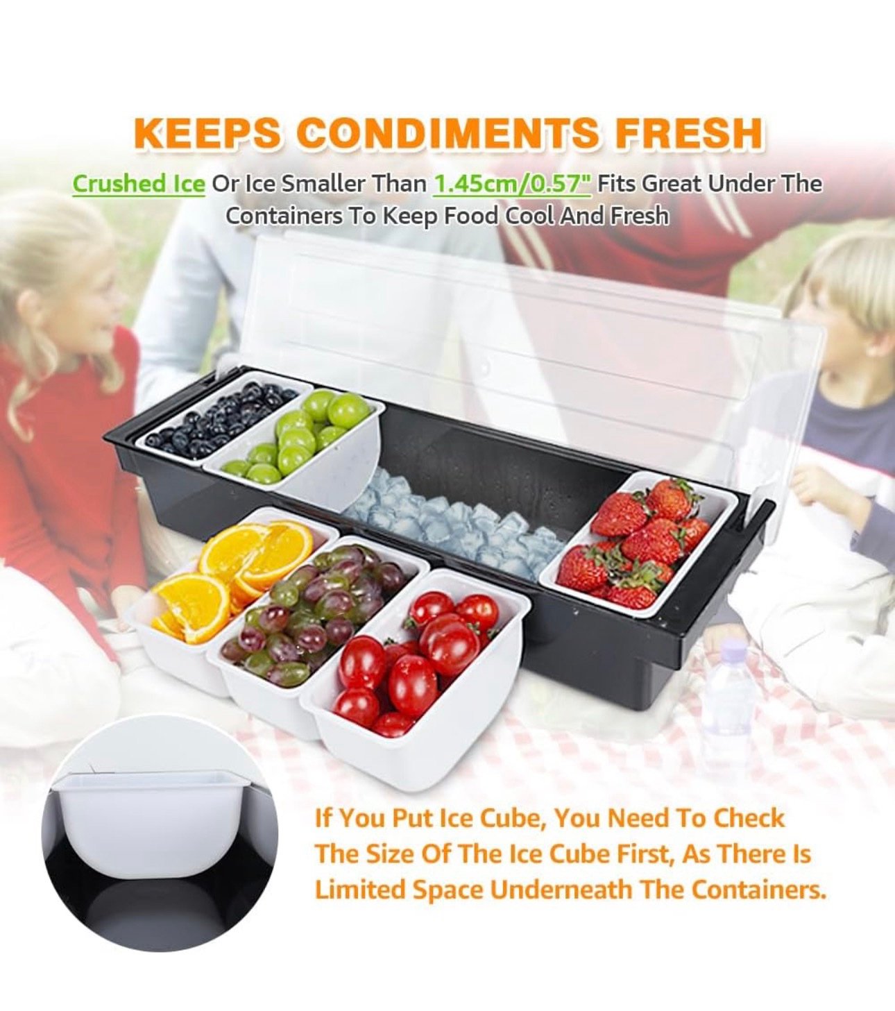 - Protecting food fresh:ice can be placed in one of condiment trays,keeps topping fresh,the lid is not air-tight but comes down enough to protect the food from flies and such that seem to find their way around outdoors