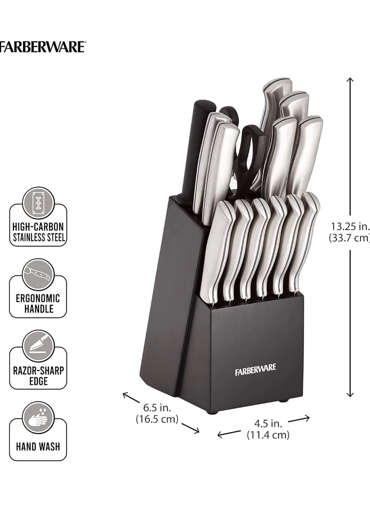 - EASY CARE: Farberware knives should be hand-washed with warm water and a mild detergent. Rinse and dry immediately. Stainless steel knives are not dishwasher safe. Lifetime limited warranty.