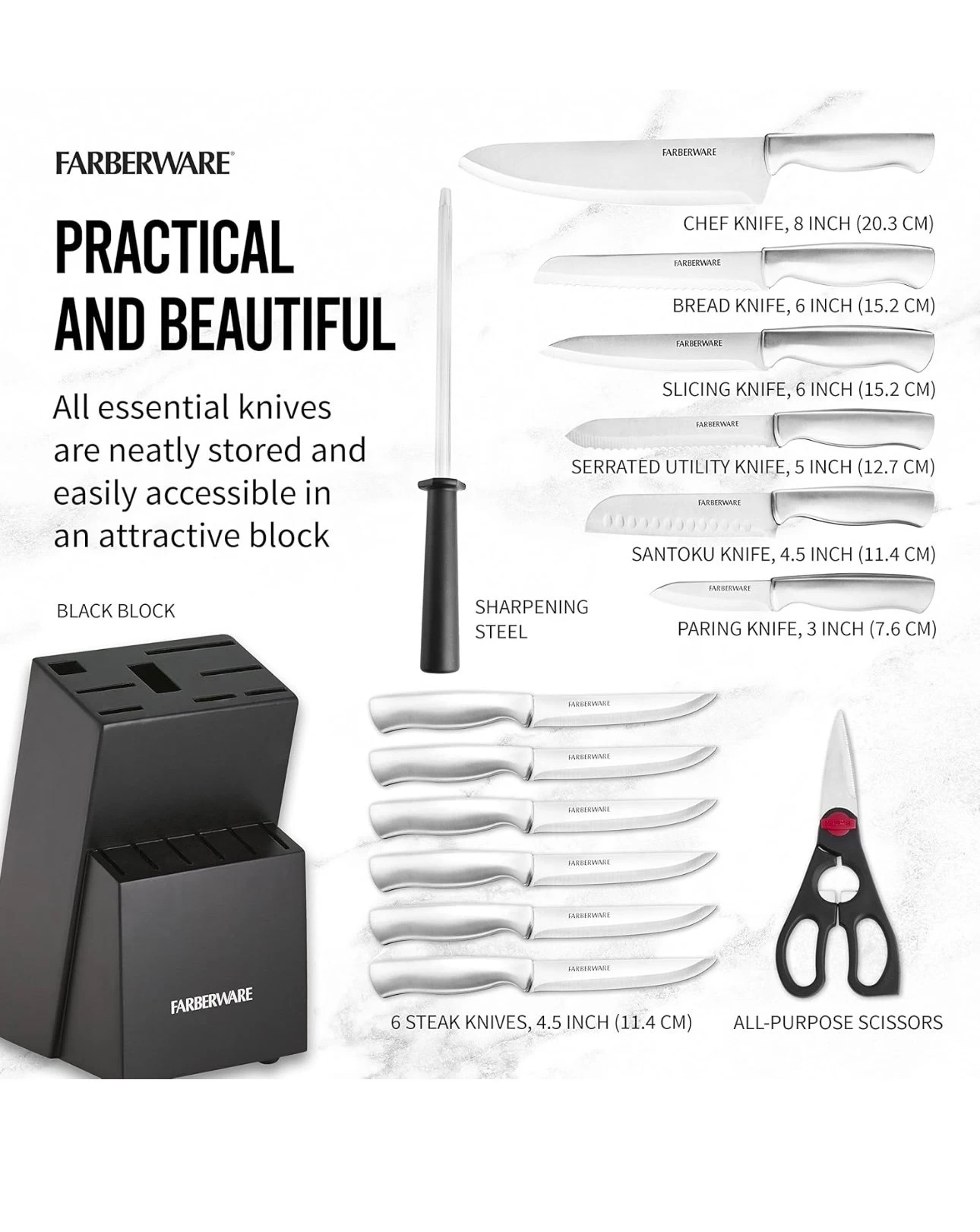- 15-PIECE SET INCLUDES: 8-inch chef knife, 8-inch bread knife, 8-inch slicer, 7-inch Santoku, 5-1/2-inch serrated utility knife, 3-1/2-inch Paring knife, scissors, a sharpening steel and six 4-1/2-inch long steak knives