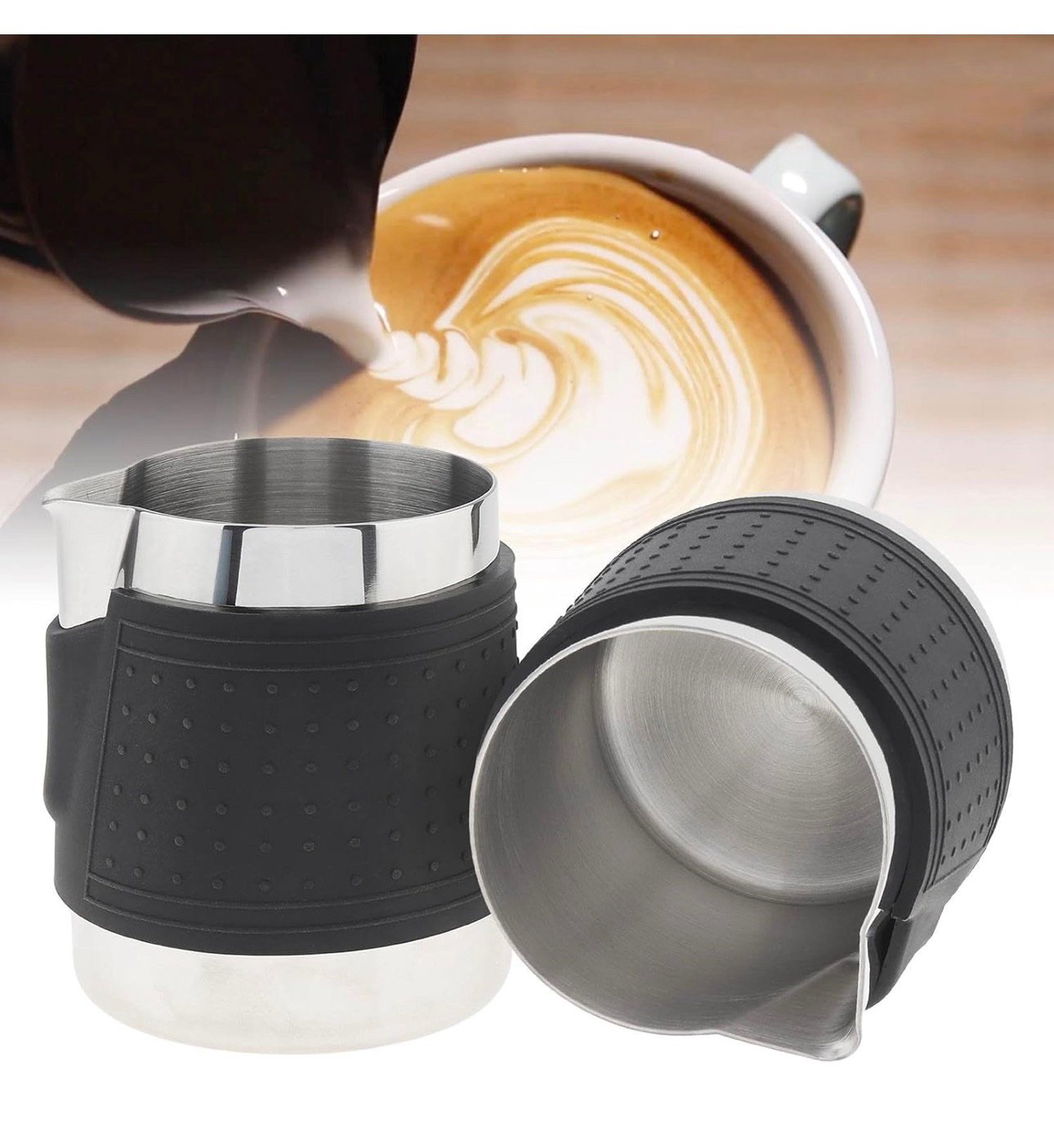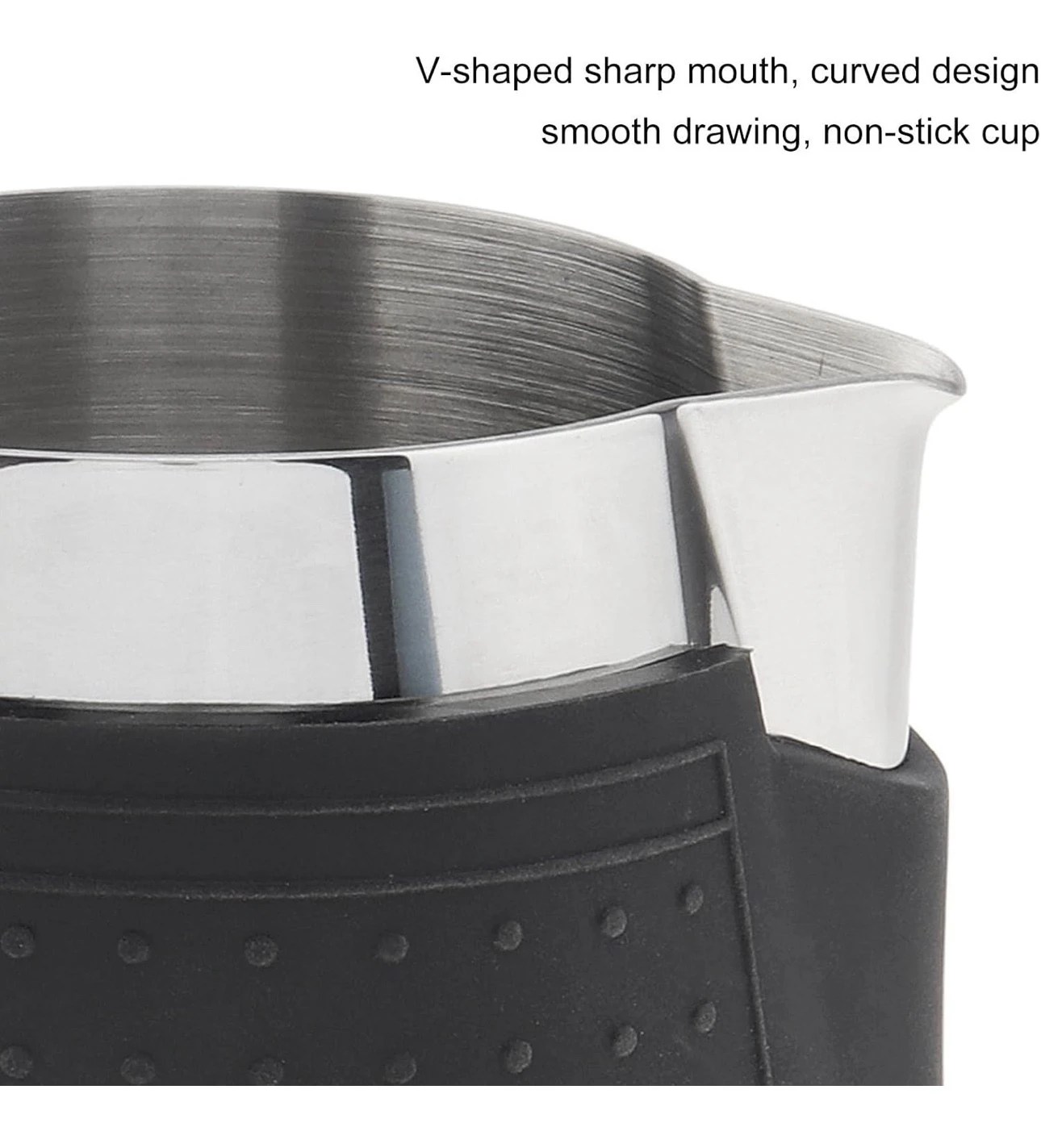 - ♨️ ANITBURN ERGONOMIC SILICONE SLEEVE – Our ergonomical silicone sleeve protects your hand from the heat generated by the hot milk so you can hold your milk frother pitcher with a safe and easy grip, allowing you to pour with maximum precision. Perfect for latte art!