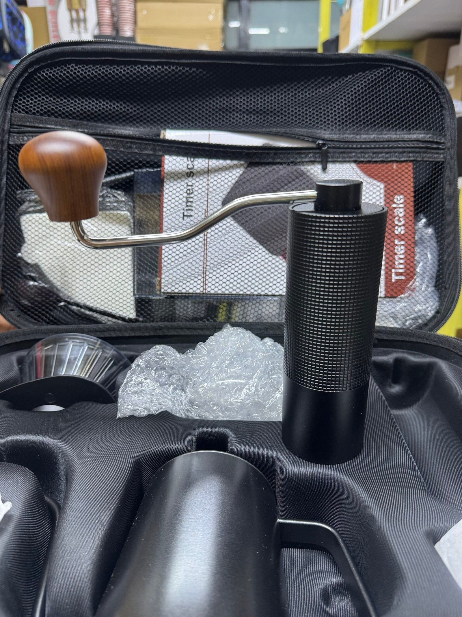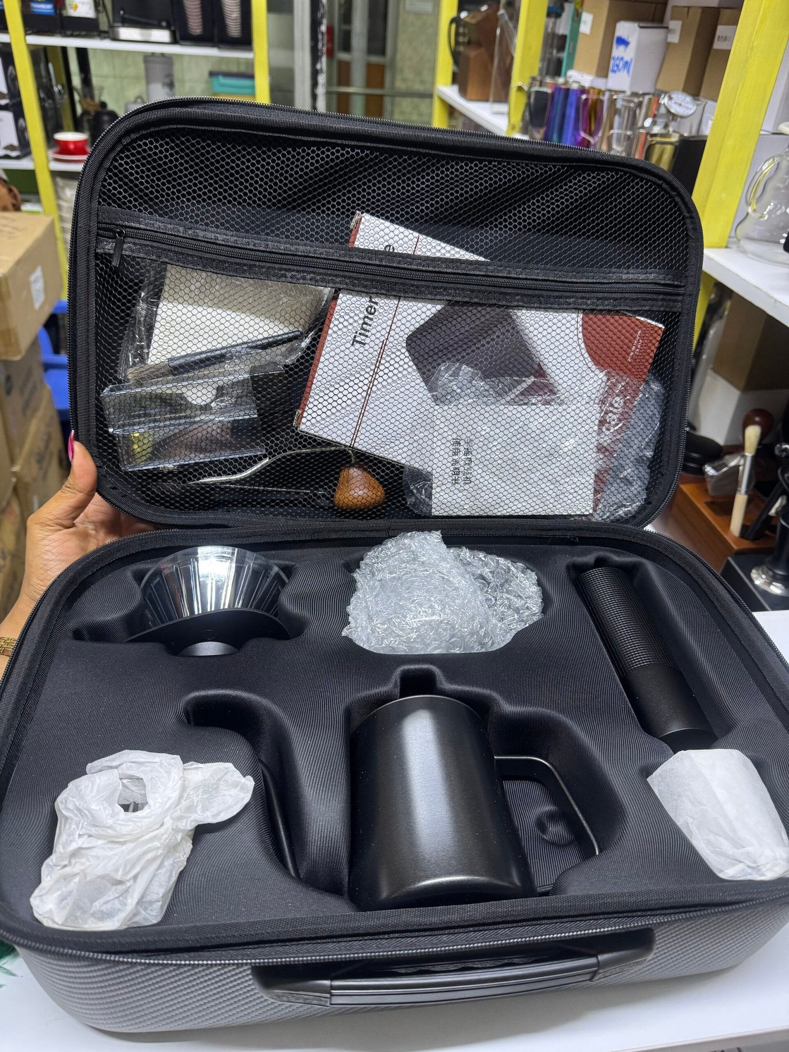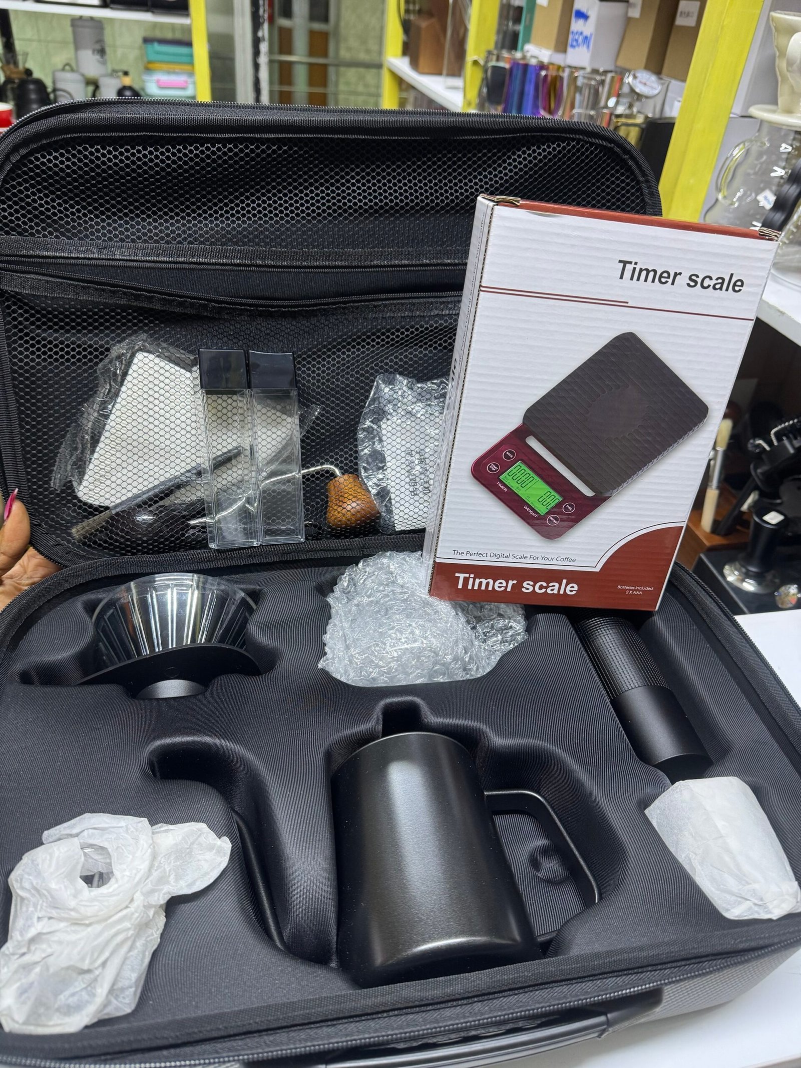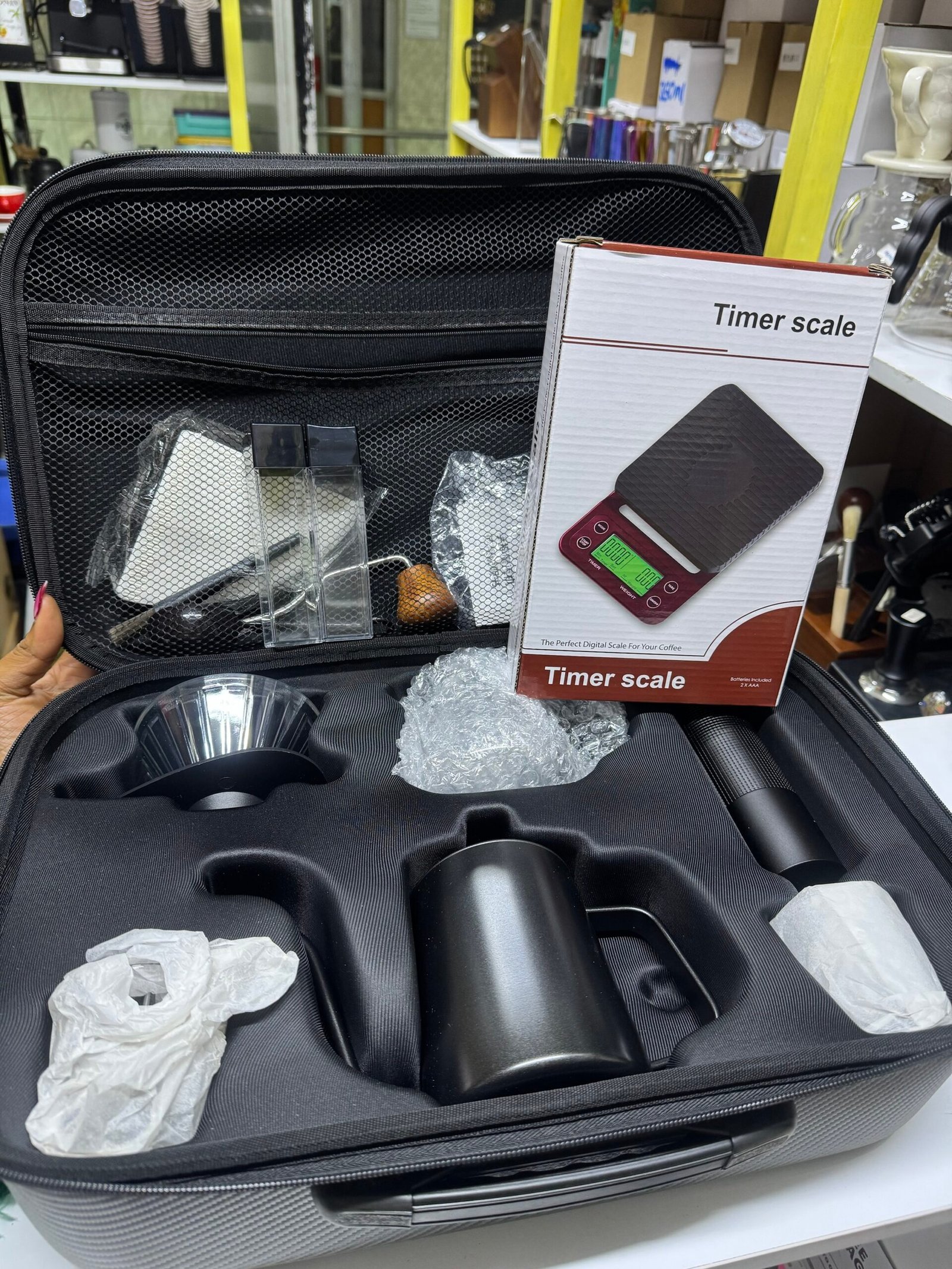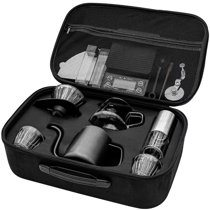 Brew café-quality coffee anywhere with this all-in-one pour over coffee kit. Includes a precision digital timer scale, dripper, gooseneck kettle, grinder, and travel-ready protective case. Designed for accuracy, consistency, and portability—perfect for home baristas and coffee lovers on the go.