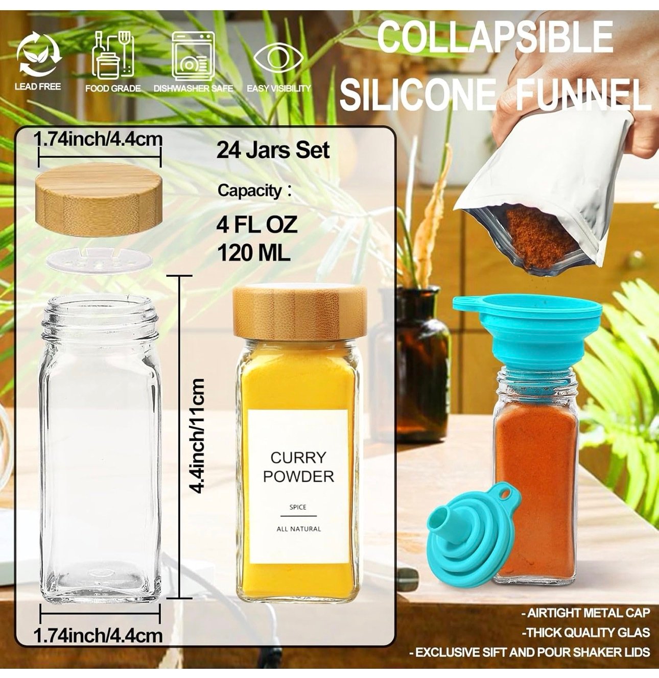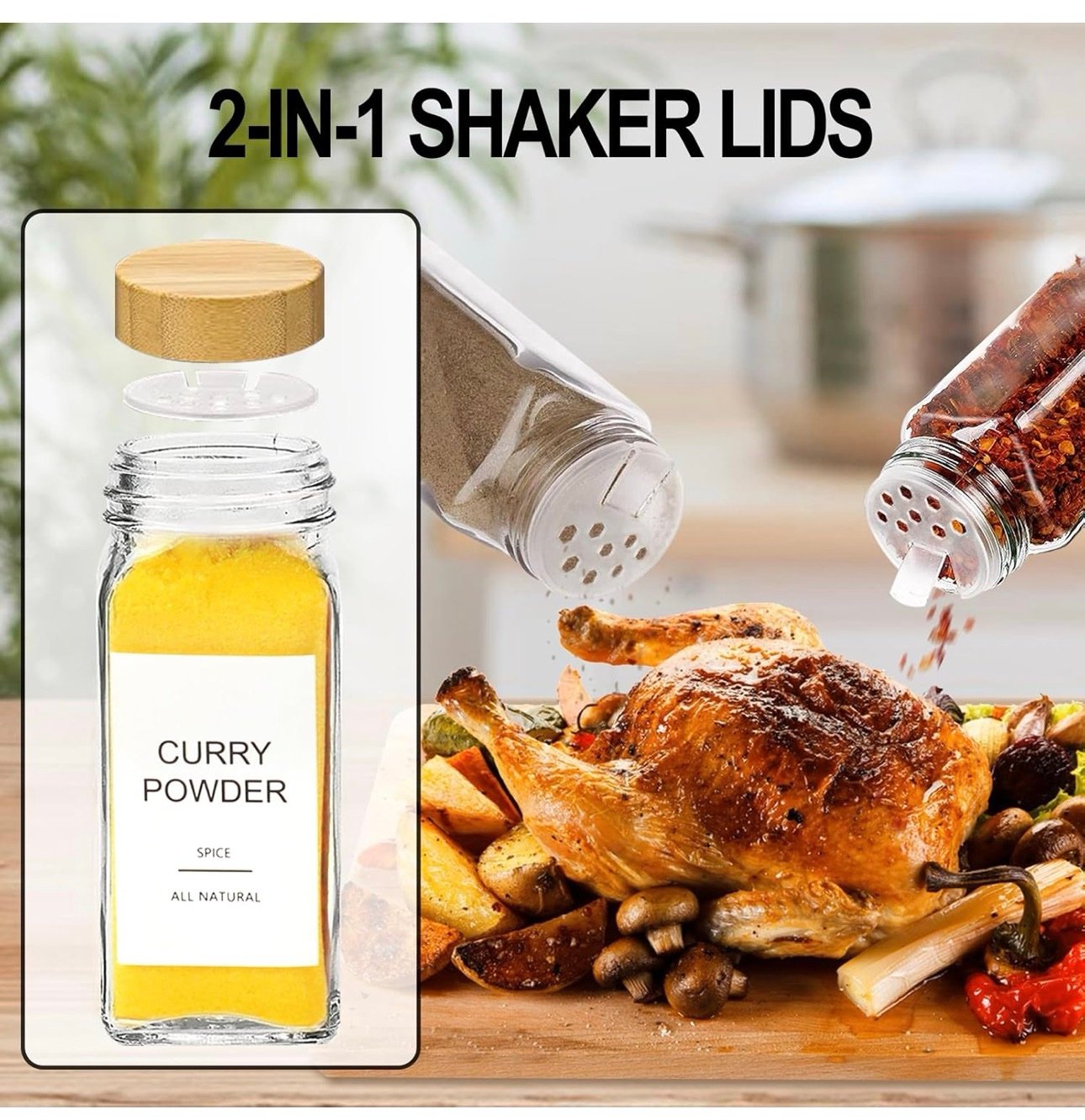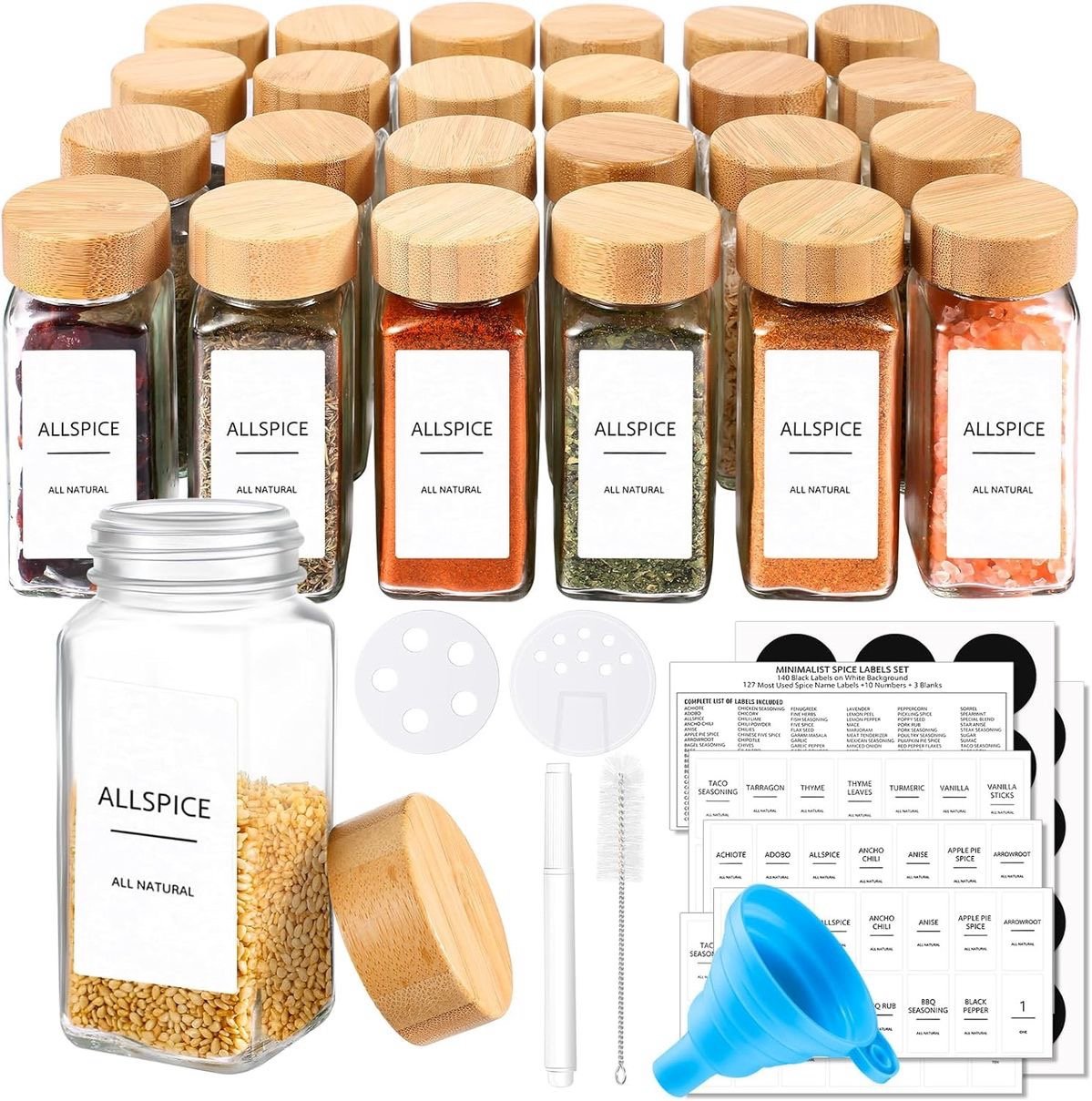 Square Spice Jars with Bamboo Lid — Glass Containers with Shaker Insert & Labels