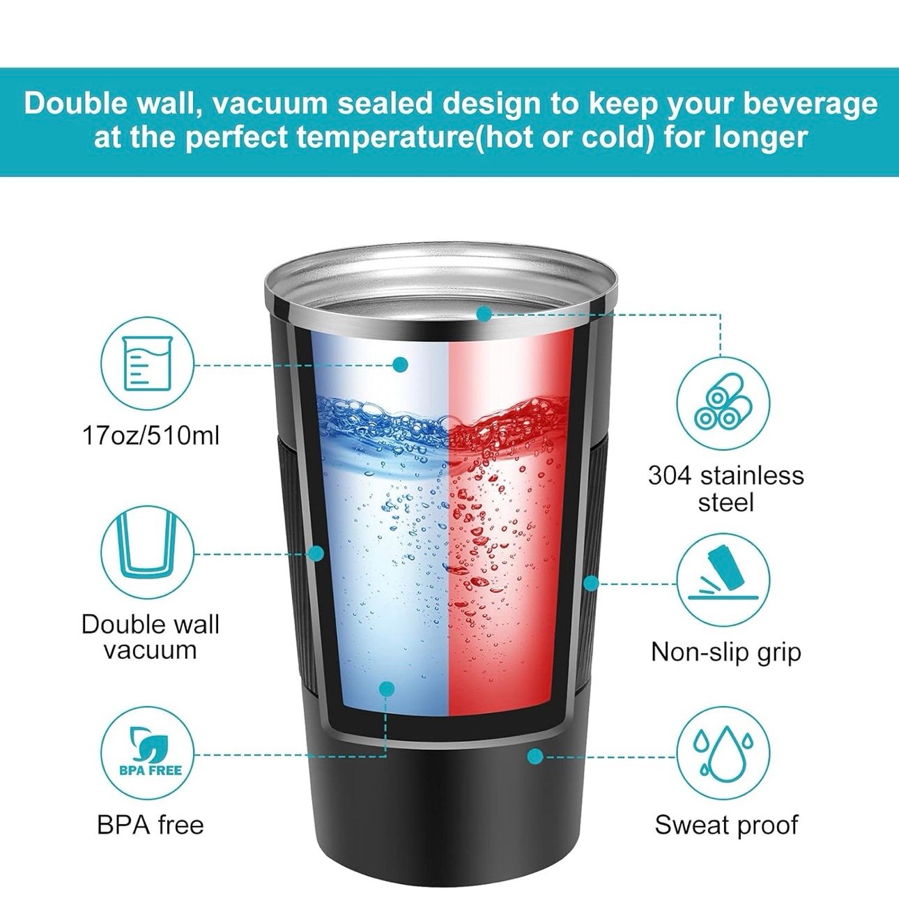 • Keep Drinks Cold or Hot for Hours — Double wall, vacuum sealed design makes the reusable coffee cup keep drinks cold or hot up to 6 hours