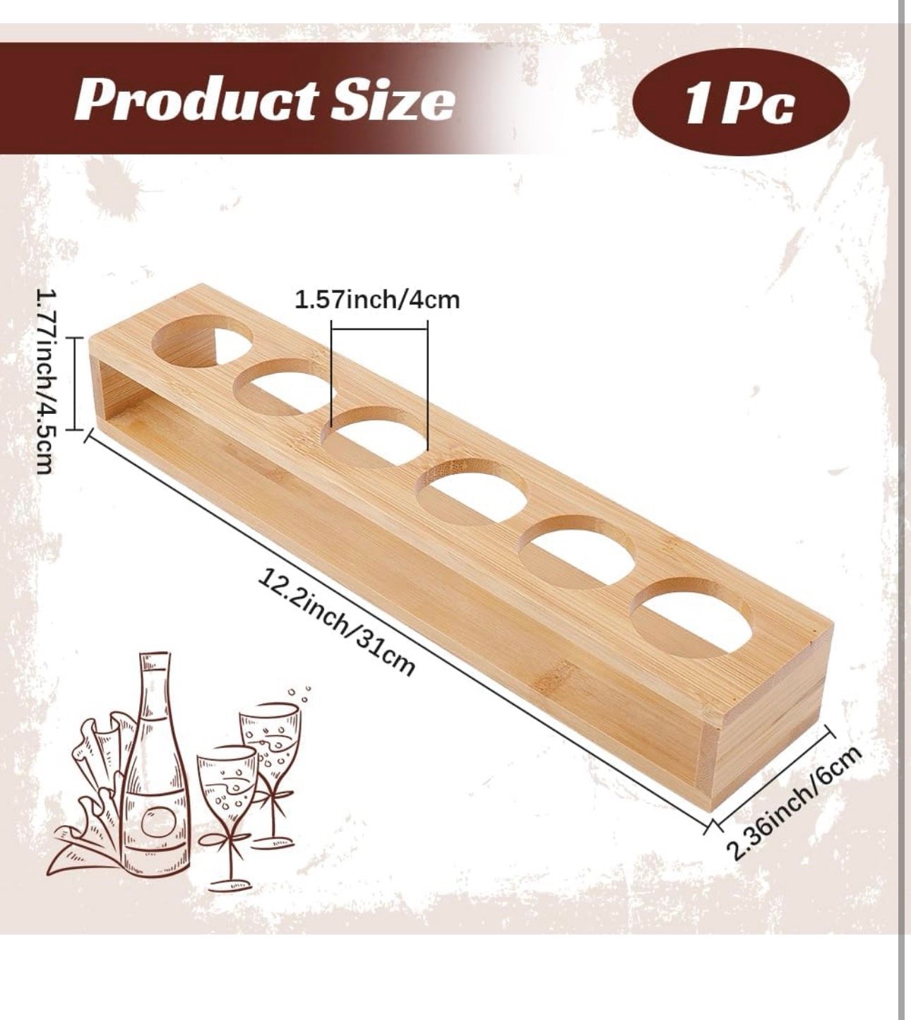 - Wooden Shot Glass Tray Size: Wooden shot glass tray: about 6cm(2.36 inch) wide, 31cm(12.20 inch) long, 4.5cm(1.77 inch) high, hole: 4cm(1.57 inch), 1pc